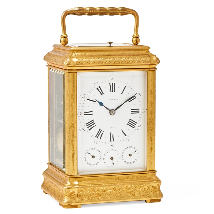 (Image: A fine French engraved gilt brass giant grande-sonnerie striking calendar carriage clock with alarm retailed by Tiffany, New York, circa 1890. Sold at Dreweatts 1759 for a hammer price of £6,500, September 9, 2025) |
