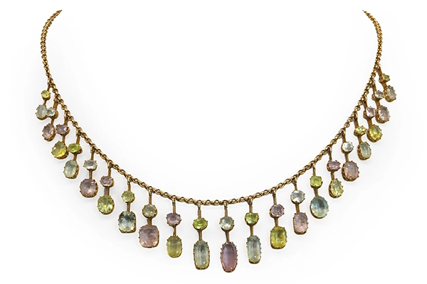 (Image: Edwardian pink topaz, aquamarine and chrysolite fringe necklace, c.1905) |